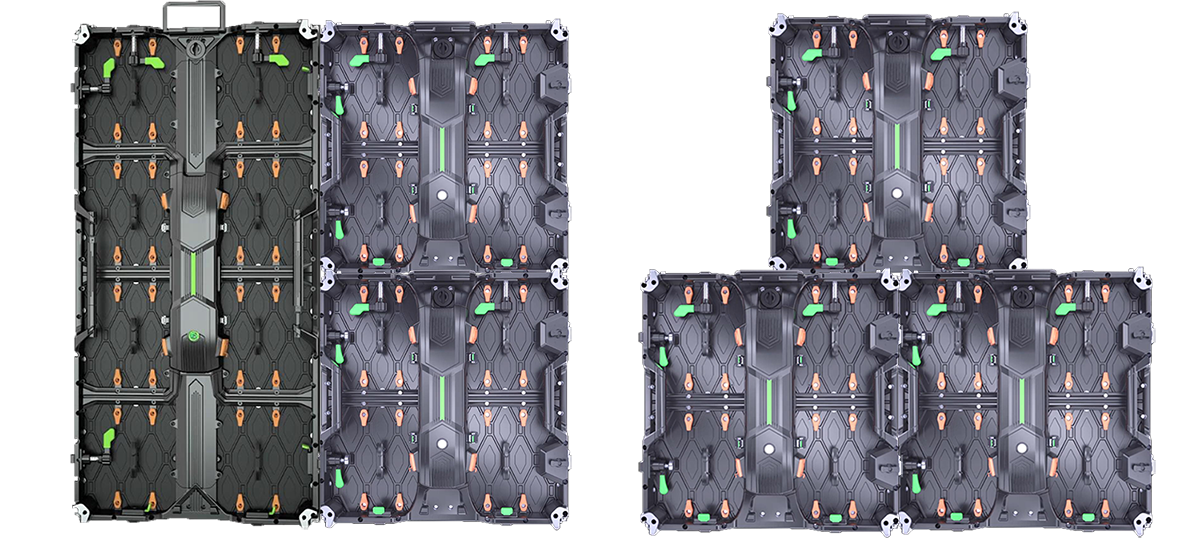 Hægt er að blanda saman 500x500mm LED skápnum og 500x1000mm LED skápunum, sem er gott til að búa til sérstaka lögun LED skjáa. Hægt er að blanda saman hraðlæsingum vinstri og hægri.